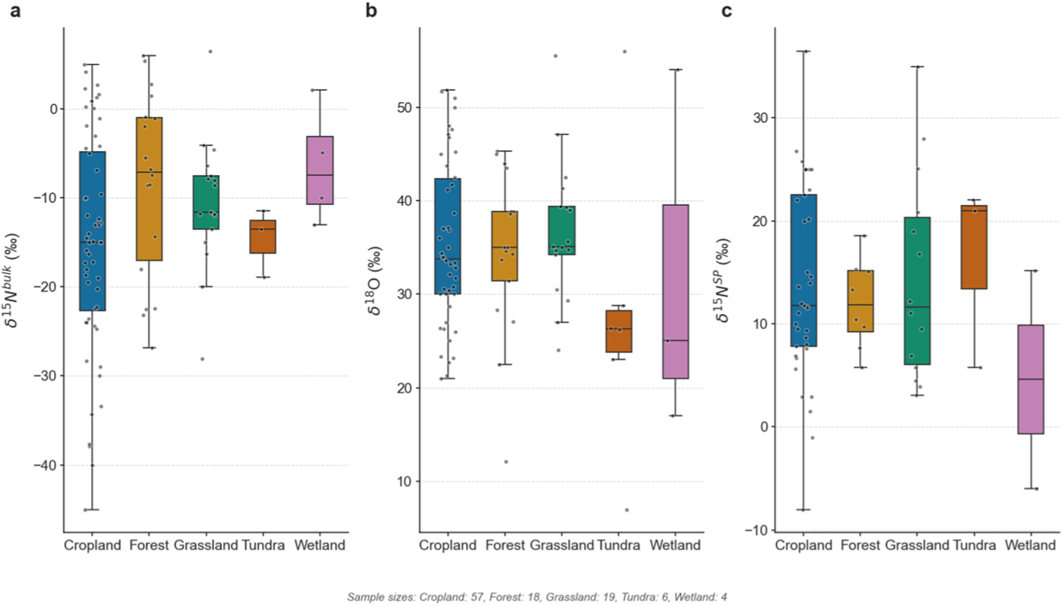 The distribution of N2O isotopic signatures across different ecosystems: From left to right, mean values and ranges for δ15Nbulk, δ18O, and δ15NSP for different ecosystem types.